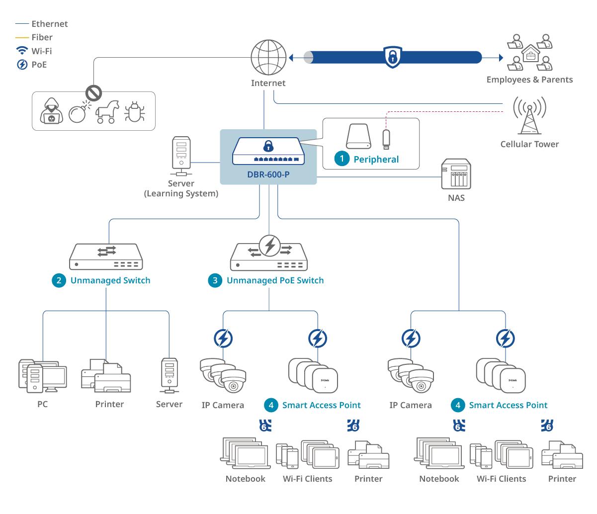 It offers high port density with 2.5G-speed connectivity and can rapidly and flexibly expand network capacity through its diverse interface. For teleworkers, the DBR-600-P ensures seamless access to the office network anytime, anywhere. For small offices, it effectively blocks malicious traffic, safeguarding your network. Additionally, the built-in management platform simplifies AP management, boosting efficiency and overall performance.