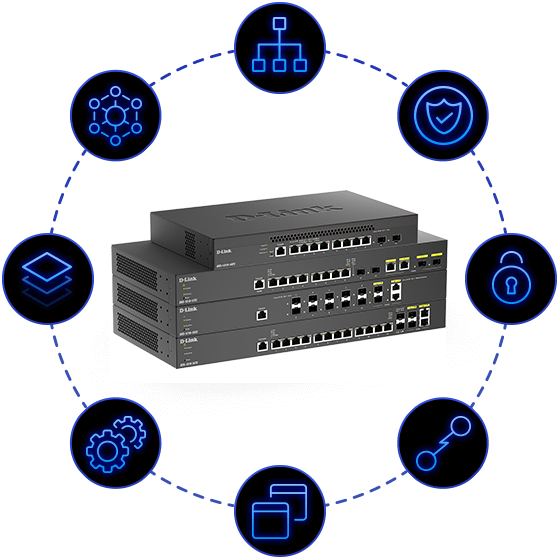 The DXS-1210 series includes layer 2 features such as port mirroring, Spanning Tree Protocol (STP), and Link Aggregation Control Protocol (LACP). They also support IP interfaces, ARP, IPv6 Neighbor Discovery (ND), default routing, IPv4/IPv6 static routing, IGMP and MLD Snooping, auto voice and surveillance VLAN, LLDP and LLDP-MED.
