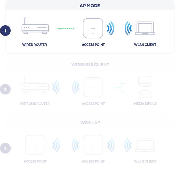 Use as an access point (AP), wireless client, Wireless Distribution System (WDS) or Wireless Distribution System with AP (WDS+AP).