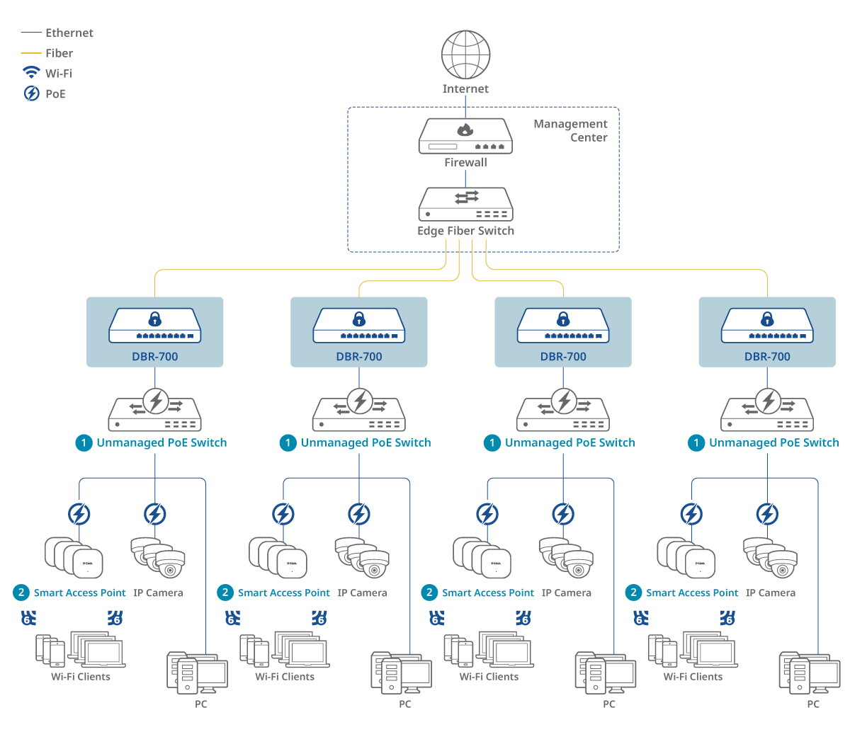 The DBR-700 features a 2.5G interface, providing higher bandwidth to support faster file transfers and lag-free, high-quality 4K/8K video streaming, enhancing daily productivity with more stable and reliable connectivity. The SFP (Small Form-Factor Pluggable) port enables long-distance data transmission, offering greater flexibility and scalability in network design. With the fiber port, businesses can easily scale their network without zone limitations.
