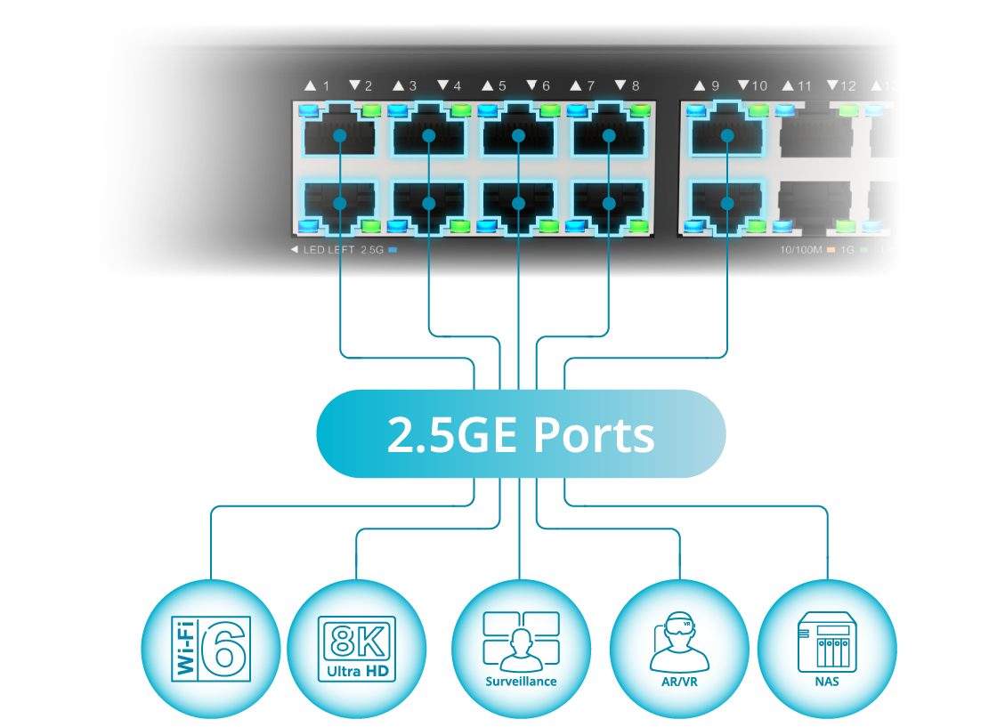 New generation Wi-Fi delivers ultra-fast speeds with low latency and standard Gigabit Ethernet can become a bottleneck. 2.5G Ethernet offers 2.5x the bandwidth without new cabling, enabling significantly faster data rates for Wi-Fi APs, smoother 4K/8K streaming, HD surveillance, AR/VR gaming, NAS, and many more applications in data-intensive environments.