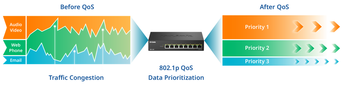 With the DMS-108P, you can effortlessly manage your network traffic with the 802.1p Quality of Service (QoS) feature. The switch automatically organizes and prioritizes time-sensitive and critical data for efficient delivery, enabling buffer-free video streaming as well as jitter-free video and voice calls.