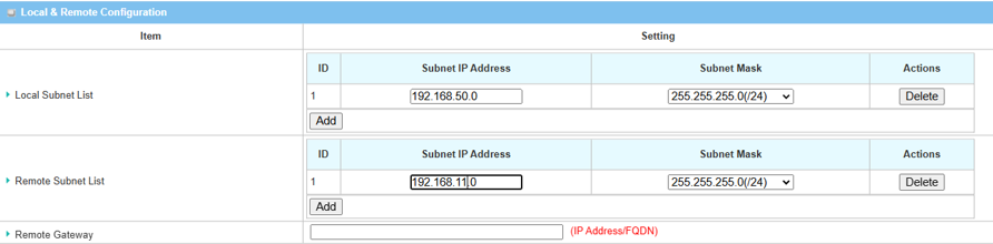 Local Subnet List Specify the local subnet IP address: 192.168.11.0 and Subnet Mask: 255.55.55.0(/24) based on this scenario