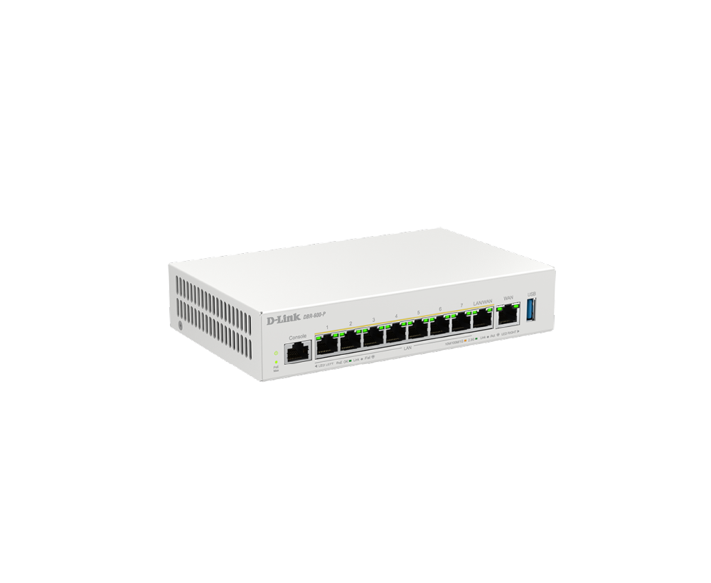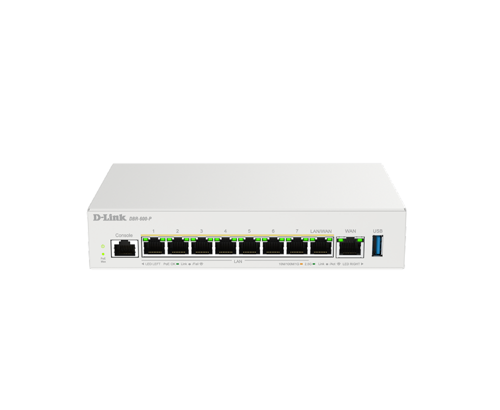 Each DBR-600-P port supports 2.5 Gbps*, giving workstations, servers, and media streams breathing room for large file transfers and real-time traffic. All eight LAN ports also supply PoE+, up to 30 W* per port, 123 W* total so Wi-Fi access points, security cameras, and phones receive power and data through the same cable, trimming installation time and cabling costs.