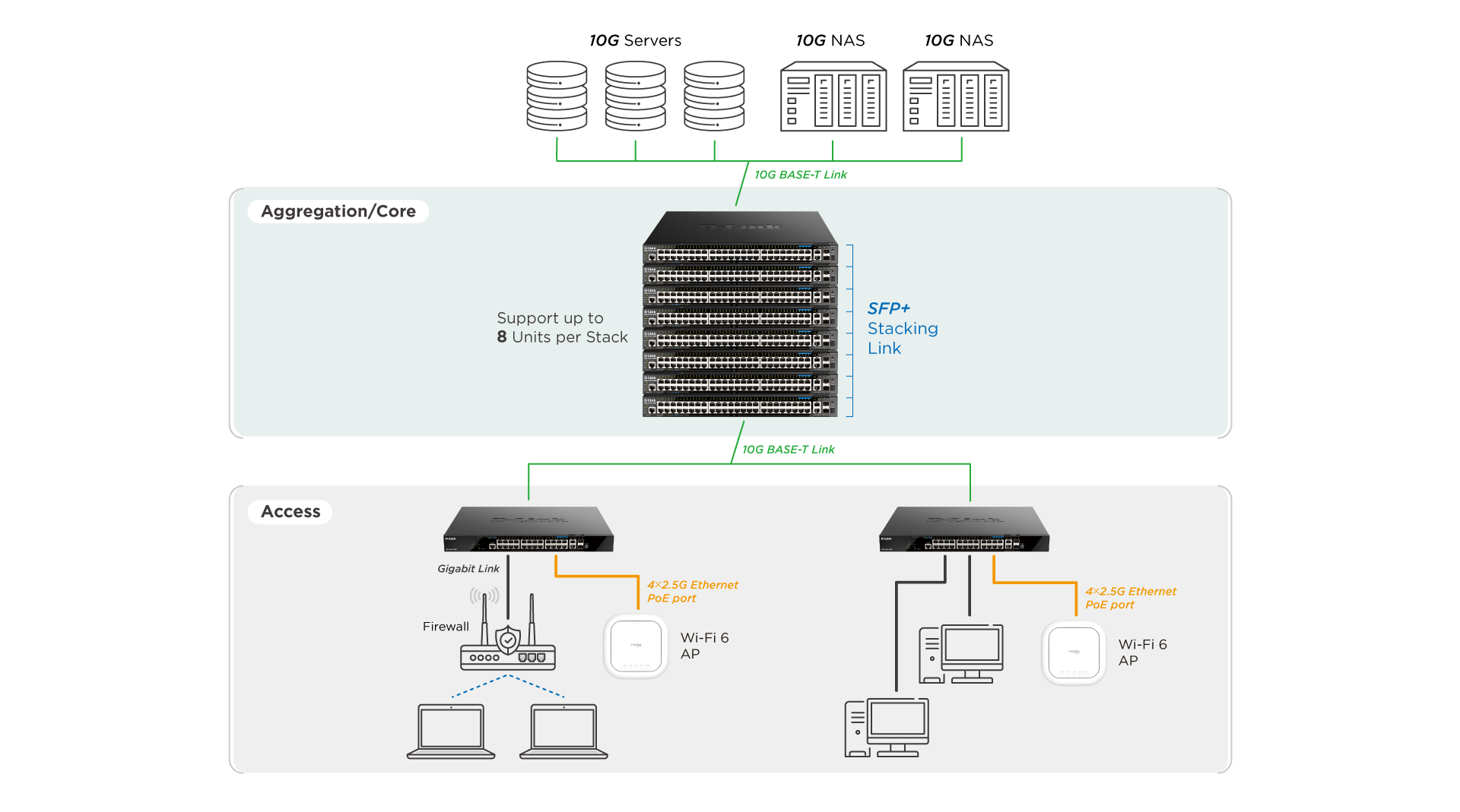 10 GB Base-T and/or SFP+ (fiber) ports for stacking or uplink