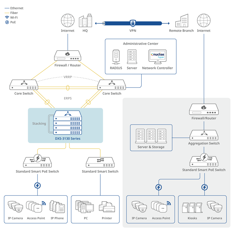 Supports versatile functions from VRRP, ERPS, STP and Physical Stacking to enhance network resilience