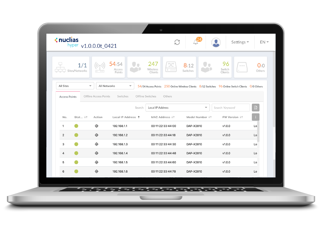 Nuclias Hyper is an enterprise solution for large-scale networks, integrating the DNC-5000 software controller with compatible Nuclias switches and access points to provide unified monitoring, rapid deployment, and scalable expansion across distributed sites.