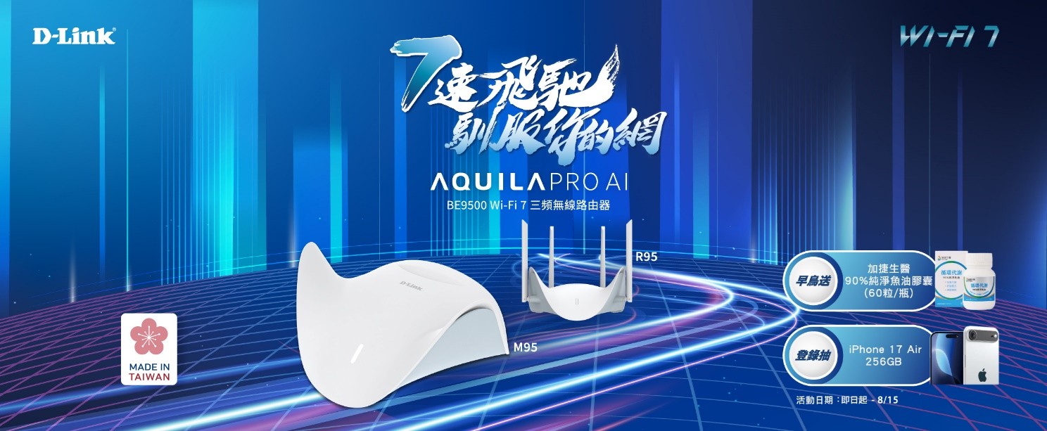 為慶祝R95/M95正式上市,D-Link特別推出早鳥好禮促銷活動:即日起至2025年8月15日止,凡於全台實體與線上通路購買R95或M95,並完成官網產品註冊與購買憑證上傳,前200名早鳥登錄者可免費獲得市價$1,200元的「加捷生醫90%純淨魚油膠囊(60粒/瓶)」一瓶,養網路也顧健康。此外,凡完成活動登錄的所有消費者,皆可參加超夯的「iPhone 17 Air 256GB」好禮大抽獎,輕鬆打造高速網路與智慧生活的完美組合。