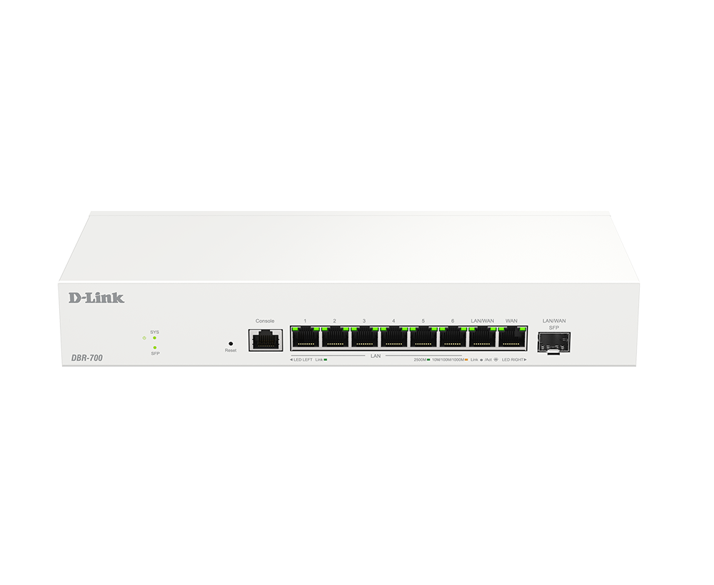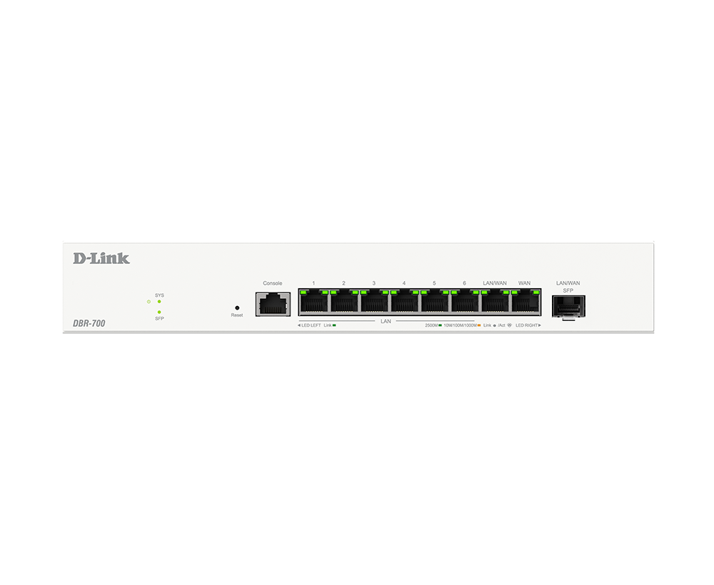 DBR-700 透過其 2.5G 高密度網路埠提供無縫連接,而 SFP 網路埠可實現遠距離、靈活的網路擴展。多個 WAN 網路埠提供可靠穩定的網路服務,有效平衡流量。VPN 通道允許使用者隨時加入辦公室網路,並確保網路限制以提高生產力。此外,內建 AP 管理系統提供對無線設備狀態和身份驗證的集中控制。